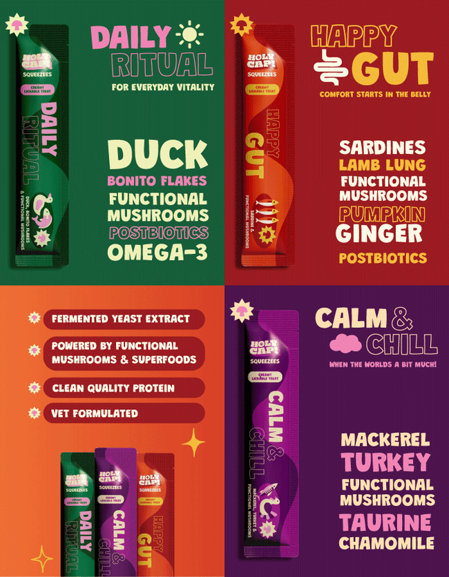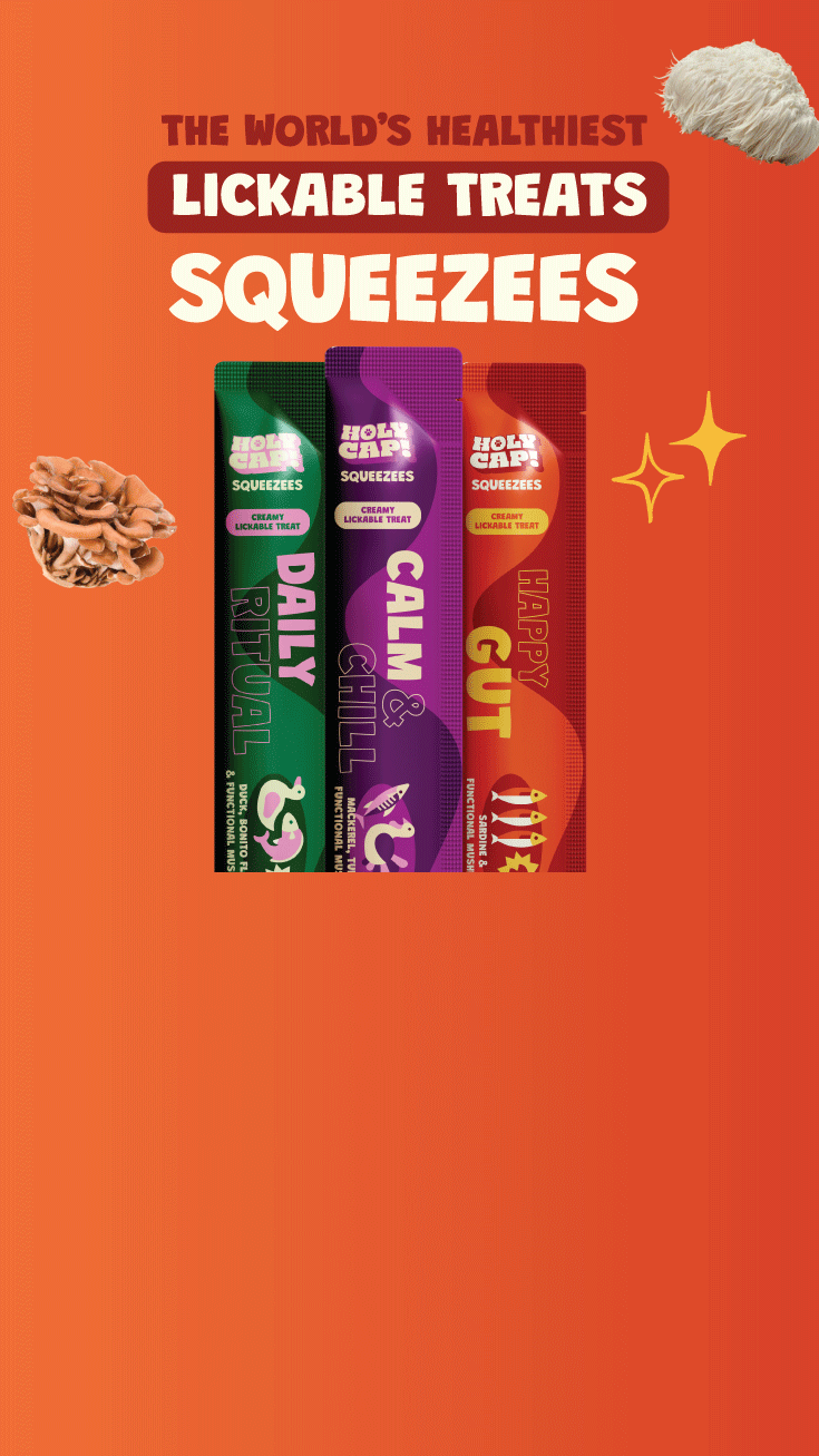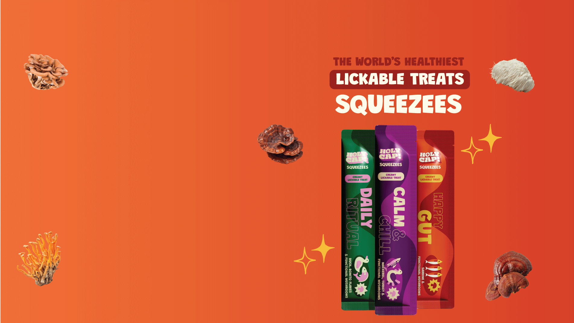 We created HOLY CAP Squeezees to elevate the tiny moments you share with your pet. Creamy, functional blends made with clean proteins, organic mushroom extracts, and wholefood ingredients. Crafted to nourish from the inside out.