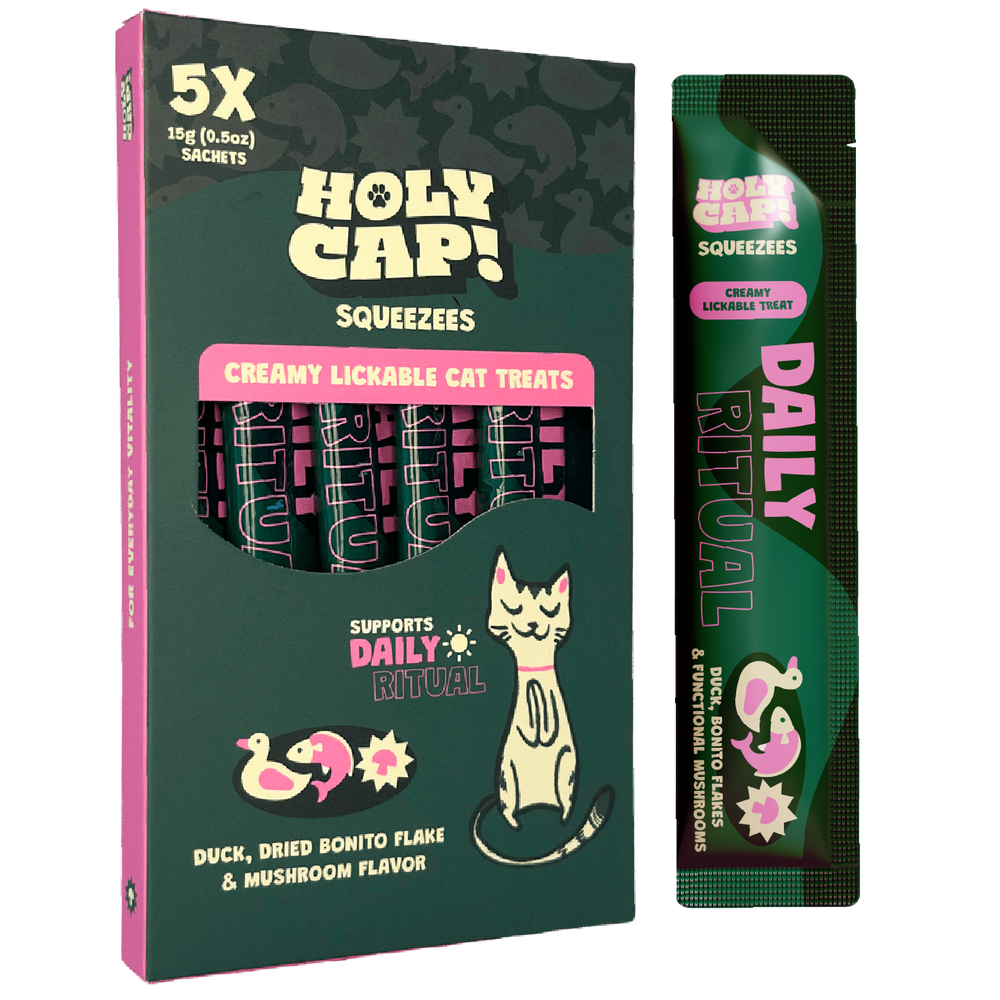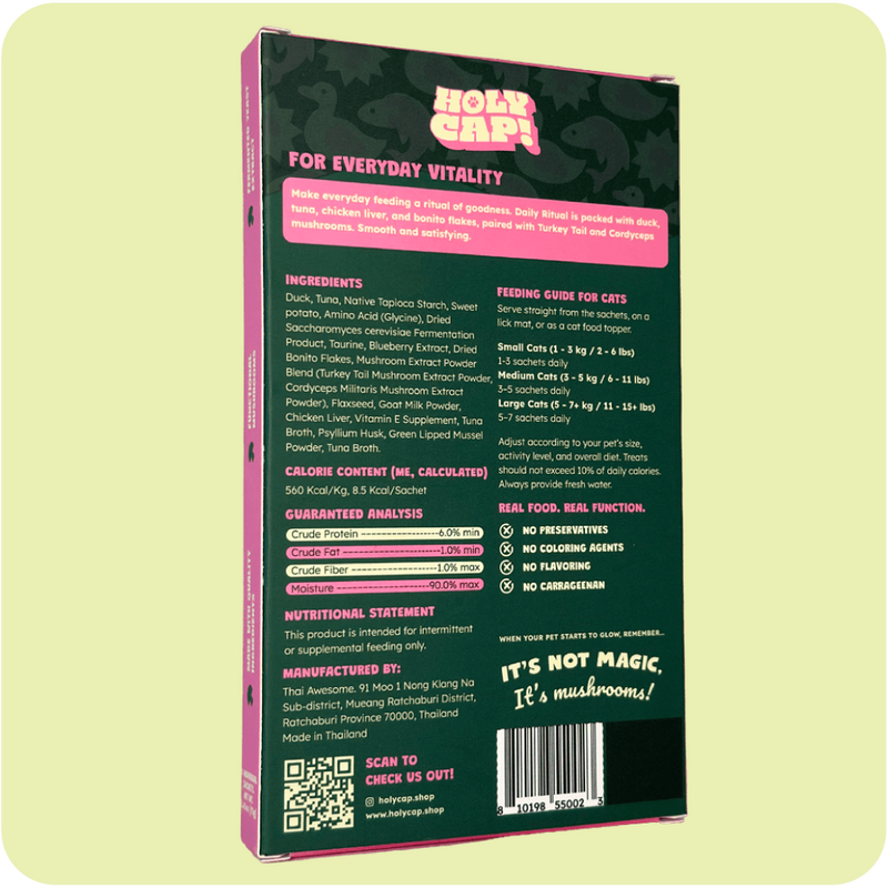 Daily Ritual is packed with duck, tuna, chicken liver, and bonito flakes, paired with Turkey Tail and Cordyceps mushrooms, ingredients traditionally valued for overall wellness. Smooth and satisfying, a blend made to nourish.