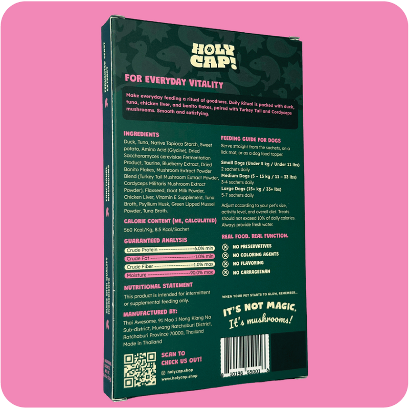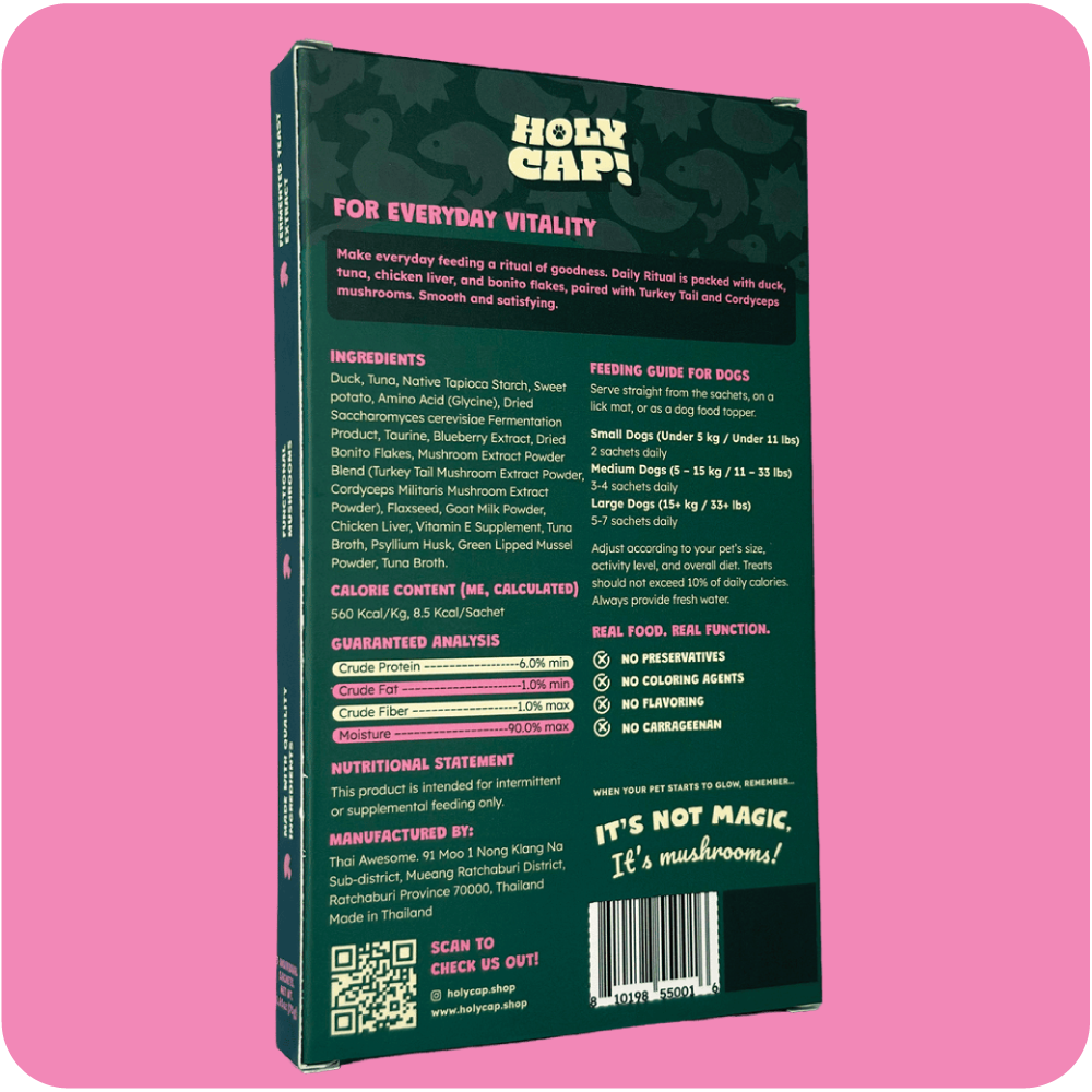 Daily Ritual is packed with duck, tuna, chicken liver, and bonito flakes, paired with Turkey Tail and Cordyceps mushrooms, ingredients traditionally valued for overall wellness. Smooth and satisfying, a blend made to nourish.